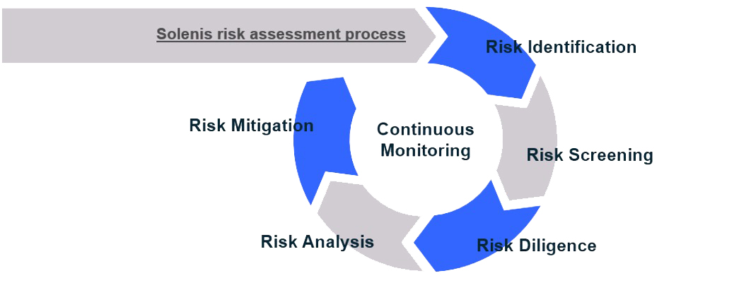 Solenis’ suppliers risk management program is a comprehensive framework for identifying, assessing, and mitigating risks associated with our suppliers. This program recognizes the critical role our suppliers play in the success of our company and seeks to develop strategies to minimize potential disruptions and safeguard our business continuity. By proactively managing supplier risks, we are able to be more resilient, enabling exceptional service to existing or new customers ,reducing the risk of financial losses, maintaining our good reputation, and achieve our sustainable commitments through partnerships within our value chain.